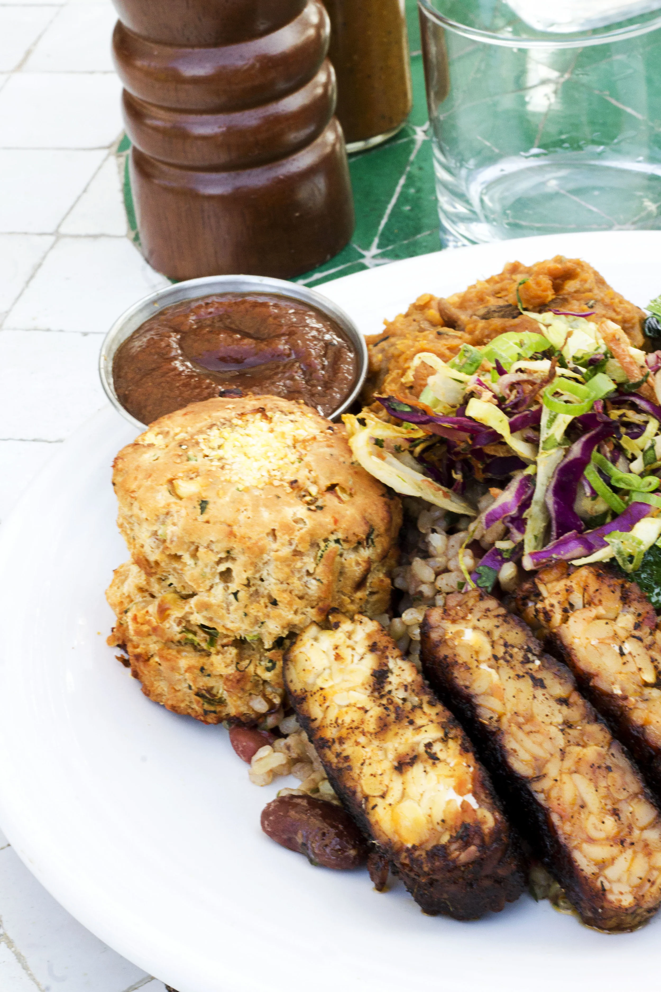 RESOLVED · 16 · southern soul food sampler, red beans and dirty rice, blackened jerk tempeh, smashed maple yams, spiced collards, coleslaw, jalapeño and macadamia cashew cheddar biscuit
