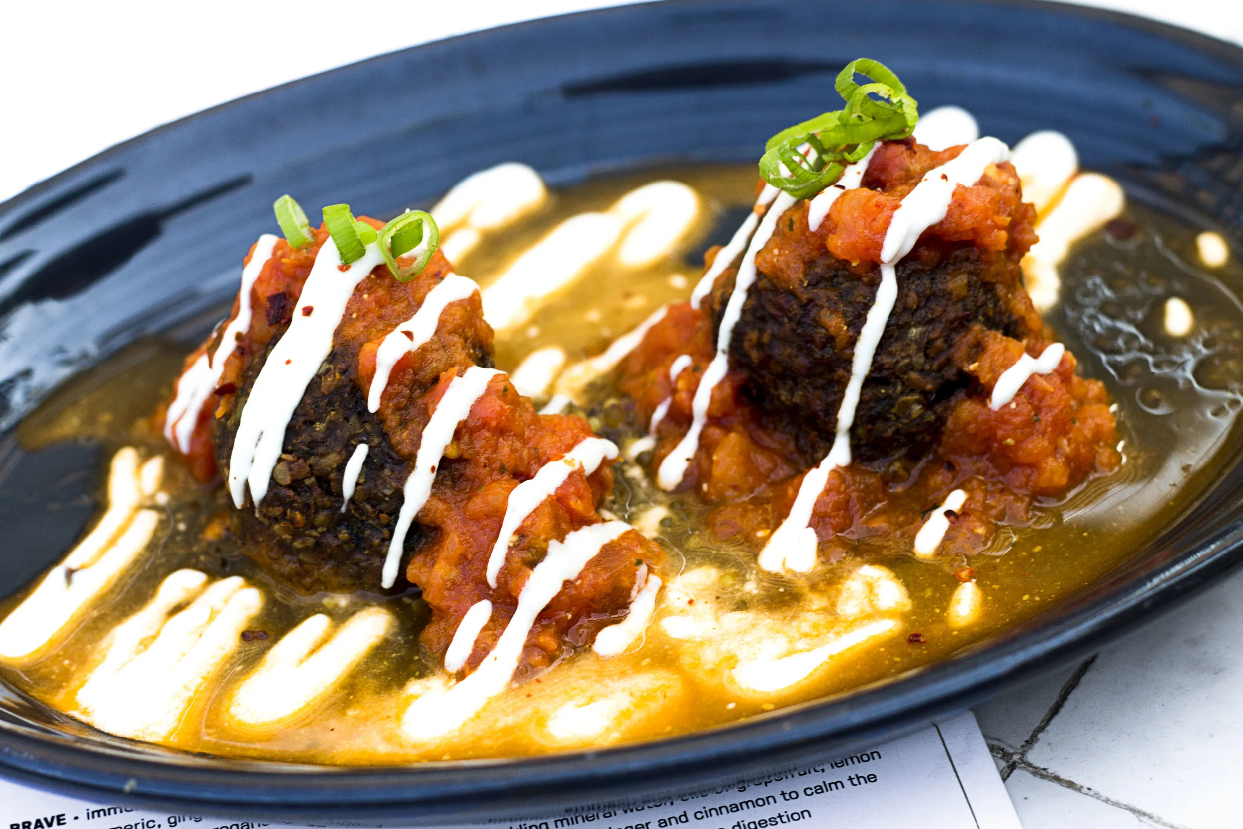 FEARLESS · 8 · Fearless orange-scented meatballs, marinara, cashew ricotta, arugula, grilled balsamic radicchio, chile flakes