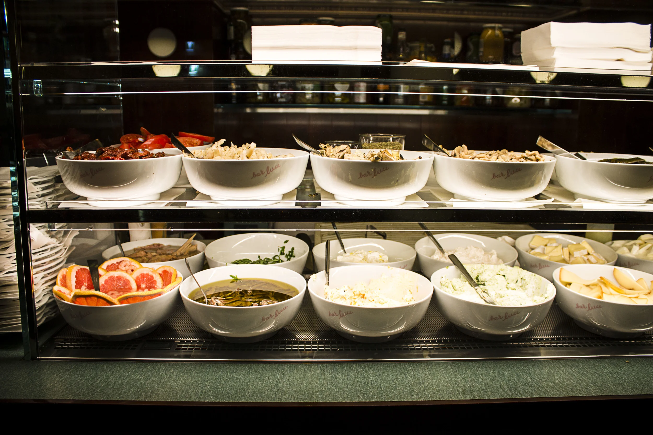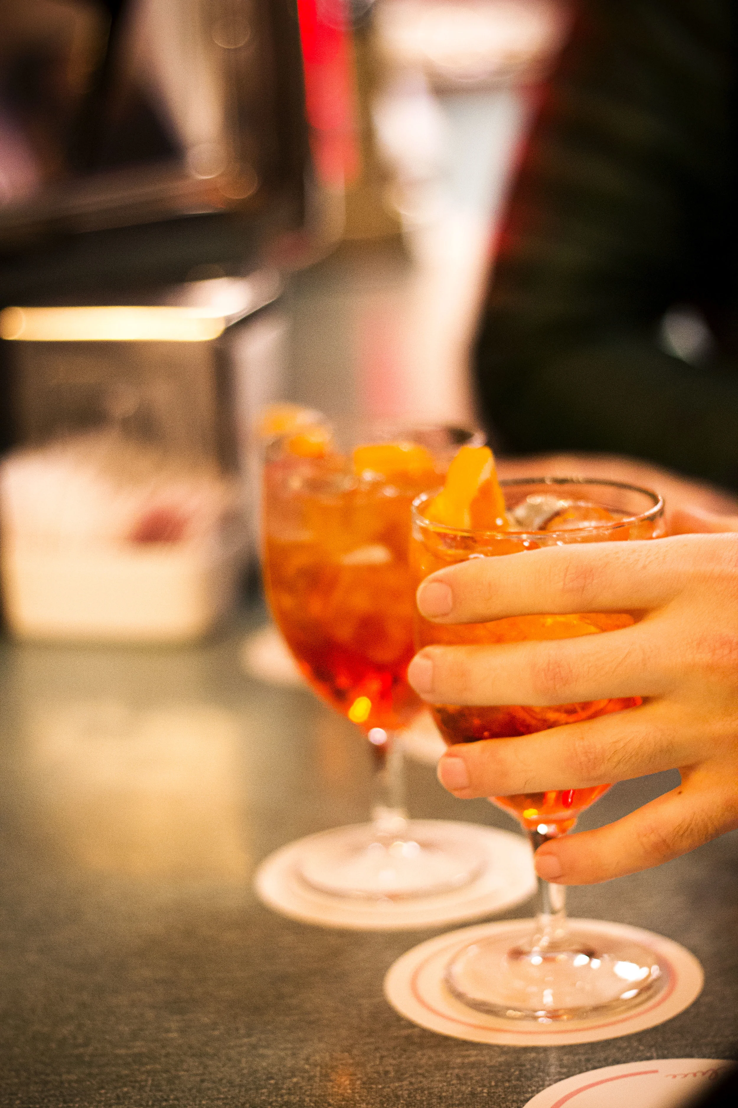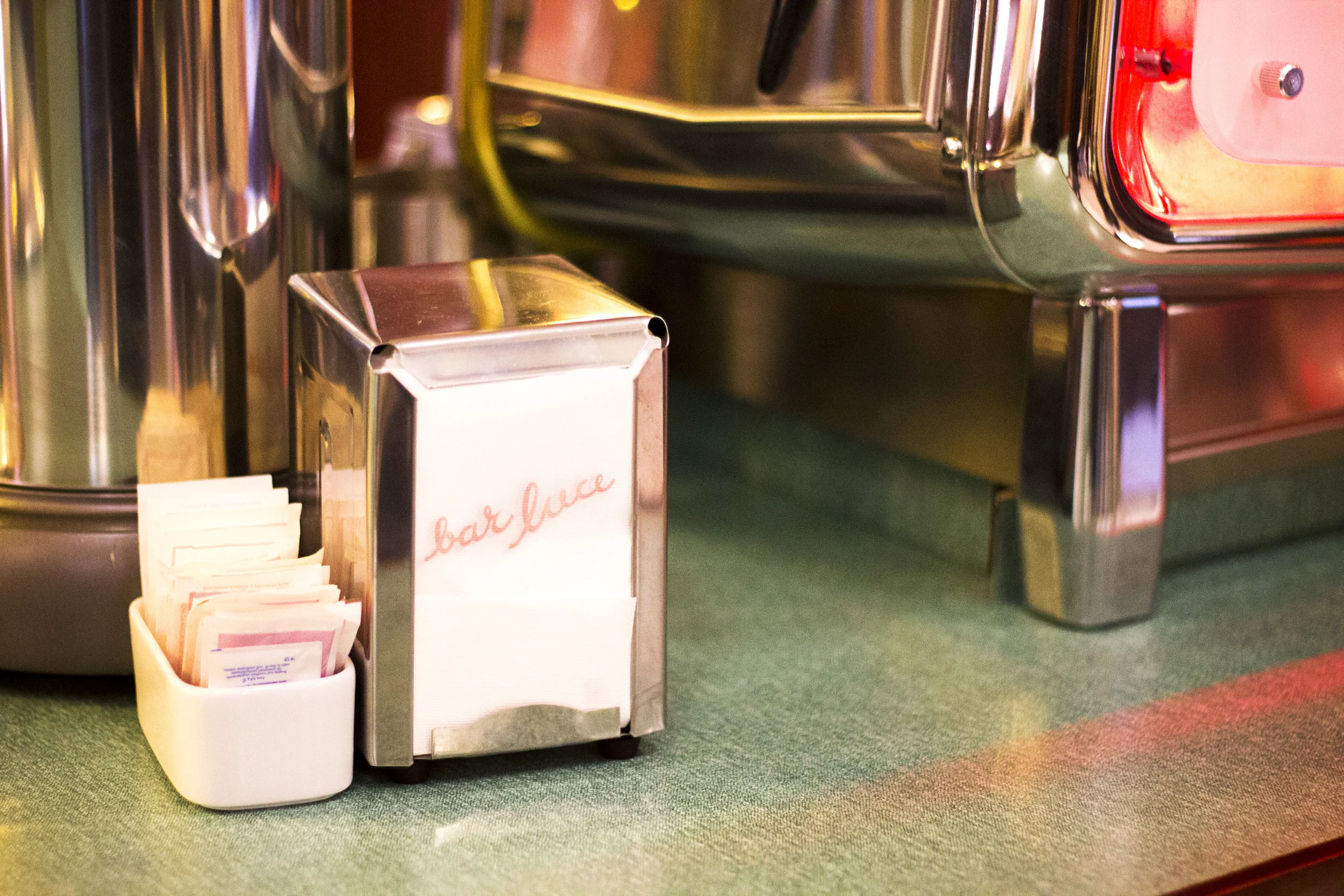 Crossing the long, stone, grey hallway, we turned the corner only to stumble into another decade. A whimsy of various sized candy jars, bustling waiters and bar tenders buttoned up in white dress shirts and black bow ties, pinball machines from the 70's and the nostalgic diner booth furniture from the very same decade. The bar was already filled with the hums and buzz of a full blown aperitivo, likely at its peak as the clock has just rounded 8 pm. This was Bar Luce.